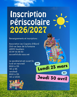 PLAQUETTE 2026 INSCRIPTION PÉRISCOLAIRE 2026-2027 MERCREDI DÉCOUVERTE ESCALADE SÉJOUR ÉVIAN COPAINS ESCALADE COPAINS FOURNEAUX Les mercredis Voir tous les mercredis Les accueils de loisirs Voir tous les accueils de loisirs Les séjours Voir tous les séjours Nos partenaires La commune de Sausheim La commune de Habsheim La commune de Battenheim La commune de Baldersheim La commune de Dietwiller La commune de Rixheim La commune de Ruelisheim